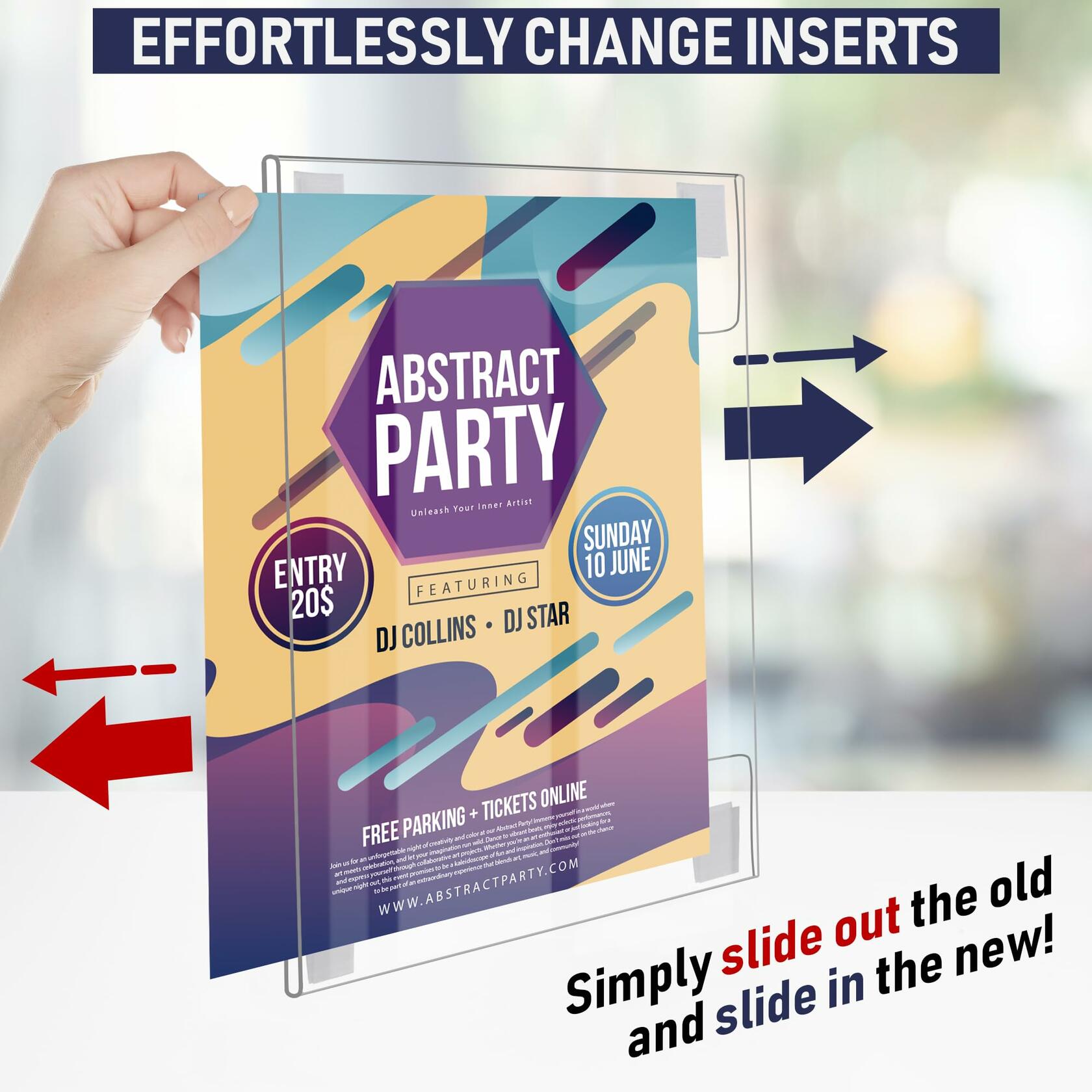 Versatile Display Options: Our acrylic frames are designed for both portrait (vertical) and landscape (horizontal) display, offering flexibility for any setting. Easily display any document, sign, or picture up to 8.5” x 11”. Ideal for advertising, menus, photographs, children’s art, or signage in offices, restaurants, or at events, these frames blend seamlessly into any space