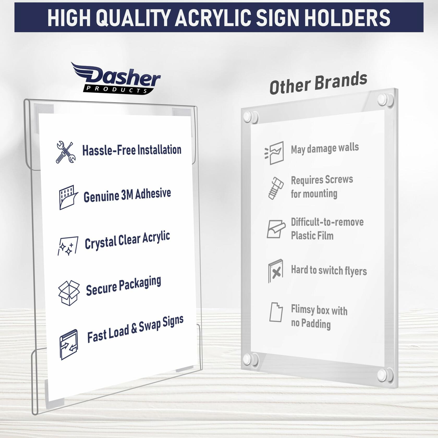 Hassle-Free Installation: Dasher Products provides well-made acrylic frames with genuine 3M adhesives for reliable mounting. Unlike competitors using cheap adhesives, we ensure long-lasting durability and security. No screws, drilling, or tools are needed, making installation quick and easy. Apply to virtually any flat surface like drywall, metal, plastic, wood, or glass. Perfect for busy environments where a clean, professional look is needed without the hassle of traditional hardware